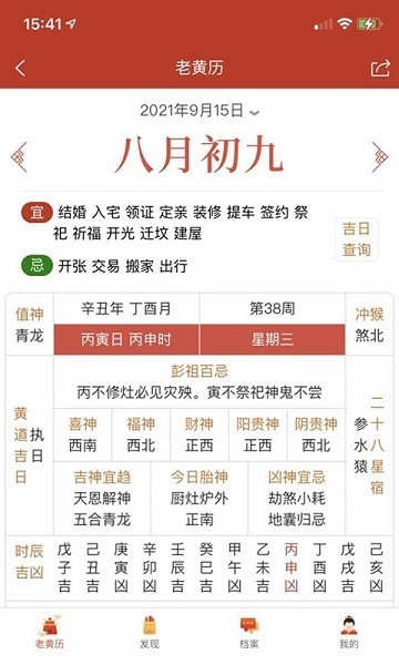 吉日查询:简单整洁的界面,给用户提供了中国传统黄历宜忌的查询功能,结婚、求学、搬家、开业、装修、动土、破屋、祈福、祭祀等等常用的宜忌日子查询功能,包含了生活、工商、建筑、祭祀等5个大类。