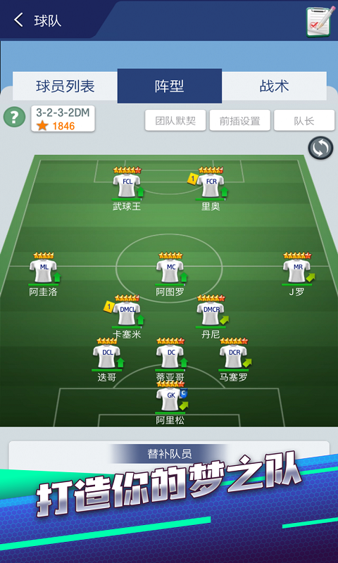 如果球队较弱那么我们尽量拿出现有球员去搭配一个合理阵型,尽量使用先用球员去触发球队的默契,但是切忌千万不要为了球员的技能,而让球员在不擅长的位置踢球。并且告诉小伙伴们一个小秘密,游戏都会有一个隐藏属性,那就是阵容的磨合度。意思就是这支球队在使用相同的球员、相同阵型的比赛越多发挥也就越稳定,但是如果小伙伴们如果变换阵型的话,那么就多打几次友谊赛进行磨合,如果有重要的比赛,尽量不要变换阵型。