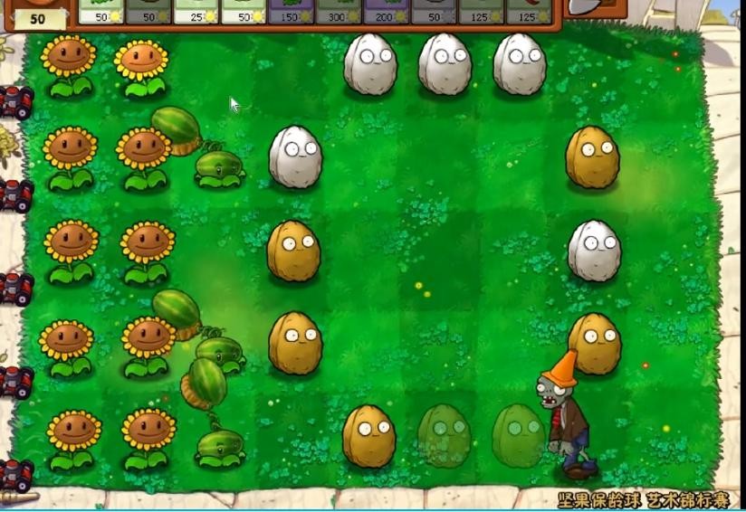 1、坚果保龄球、艺术锦标赛:选择植物时复制坚果,阻止僵尸的同时用坚果墙填满所有的外线区域就可以过关了。