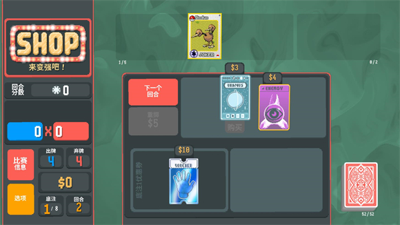 4、每张卡牌都暗藏额外的筹码获取潜力,将鼠标悬停在卡牌上就能查看具体说明。你最多可以挑选五张卡牌,点击出牌按钮即可完成本轮操作。