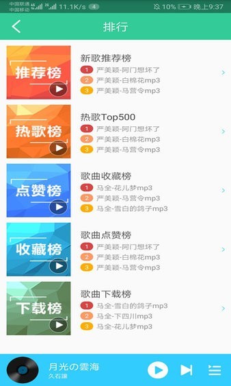 5、分类查找,按照音乐的分类查找喜欢的歌曲,线上试听音乐;