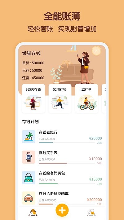 很多的时候大家是不是会有这样的错觉,怎么钱用得这么快呢?哪怕你每个月工资不算少,但却感觉老是钱不够用,更别提存住钱了。其实一款实用的省钱软件能为你的理财道路提供一定的帮助。小编就是一个存不住钱的人,如果你也和小编有类似的情况,或许就需要这样一款可以帮助你规划开支的省钱软件,这里为你带来的是懒猫存钱app,这是一款非常优秀的存钱记账软件,用户可以在这里记录自己的所有开支,也可以规划自己的存钱计划,给你带来一个良好的理财习惯,该软件的页面也是很简约的,操作也不是很繁琐,非常的简单,存钱的意义是为了更好的生活和享受人生的价值,但是这是否能是你坚持下去的目标呢,,并且软件还为你准备了贴心的记账功能,这里为你带来的是懒猫存钱安卓版,有需要的用户可以来本站下载。